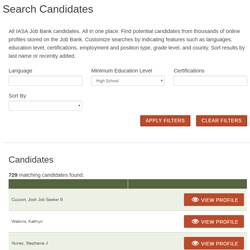 Find potential candidates from thousands of online resumes stored on Job Bank. Customize searches by indicating features such as languages, experience, and position type, grade level, and county. Sort results by last name or recently added.